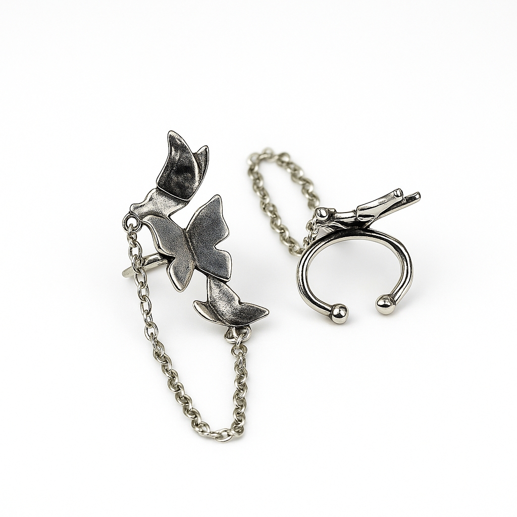 Show off your bold and elegant style with this butterfly chain silver ear cuff. Featuring delicate butterfly motifs linked with a sleek chain, it adds a modern edge to your look perfect for parties or daily wear.