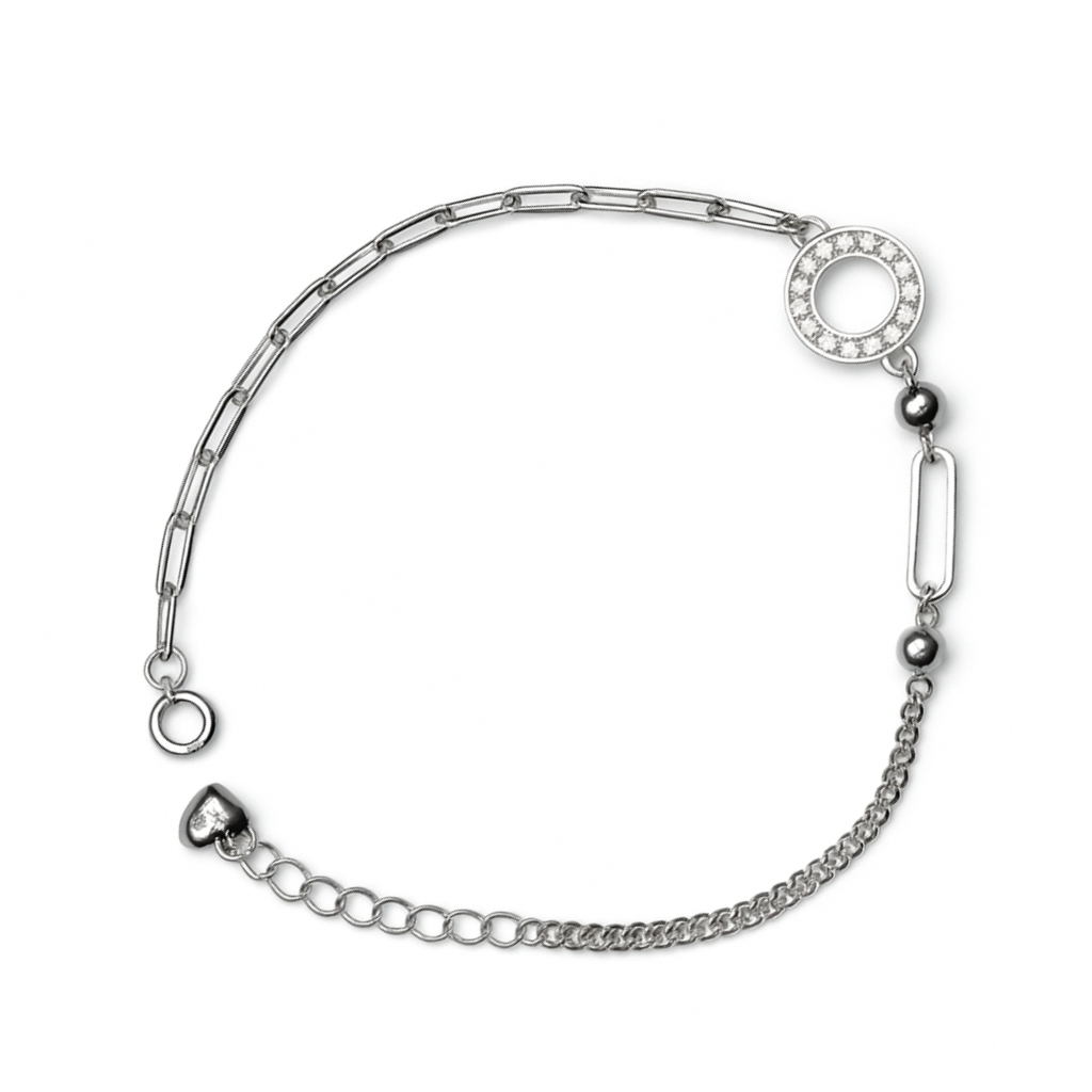 A chic 925 silver bracelet featuring a dual-chain design with a crystal-studded circle charm, sleek links, and an adjustable fit for effortless everyday style.