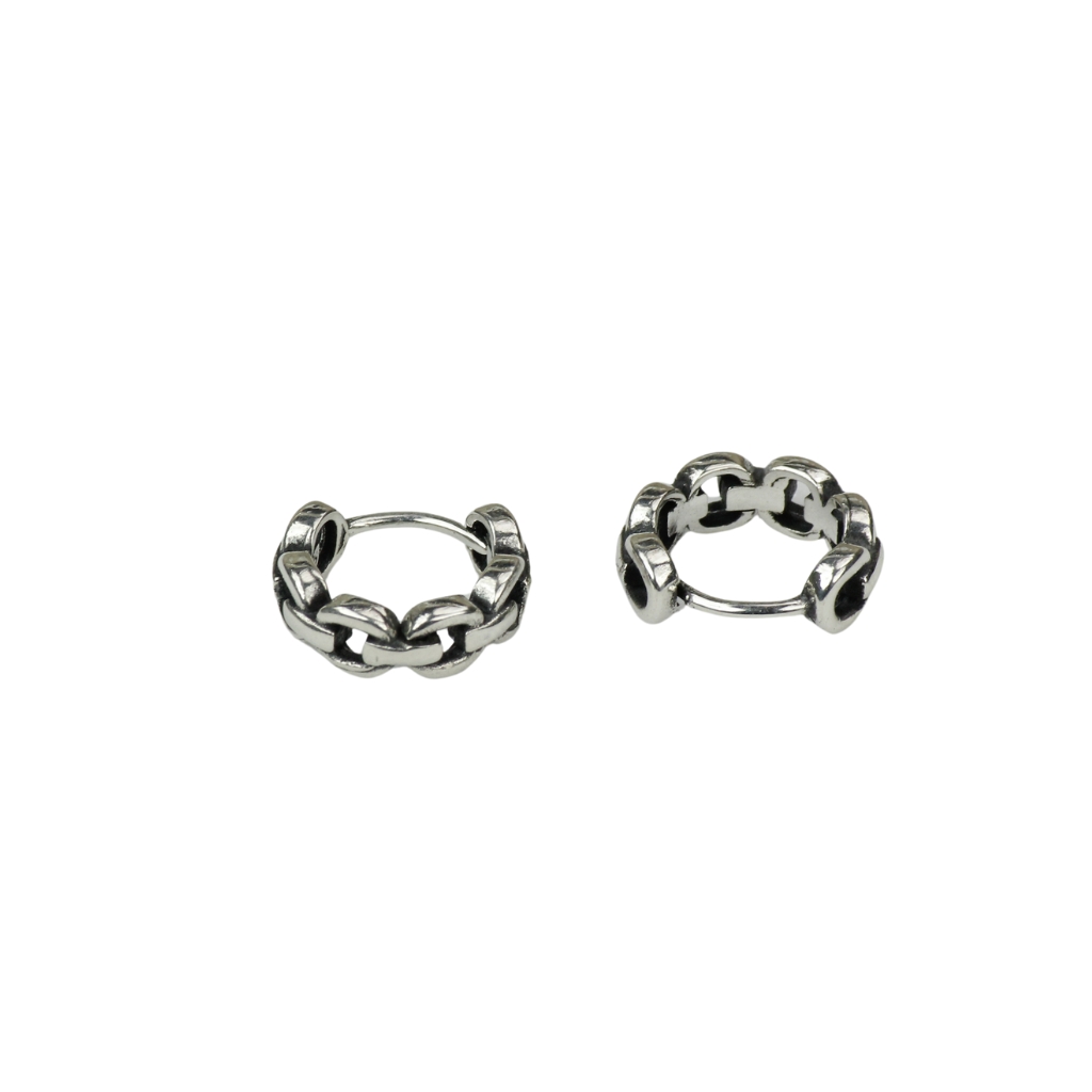Elegant and versatile, these silver hoop earrings feature an interlinked oval pattern with a polished oxidized finish. A perfect mix of modern charm and classic appeal for any occasion.