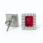Crafted in pure silver, these radiant rectangular ruby studs are surrounded by a halo of sparkling zircons a perfect blend of luxury and timeless elegance for every occasion.